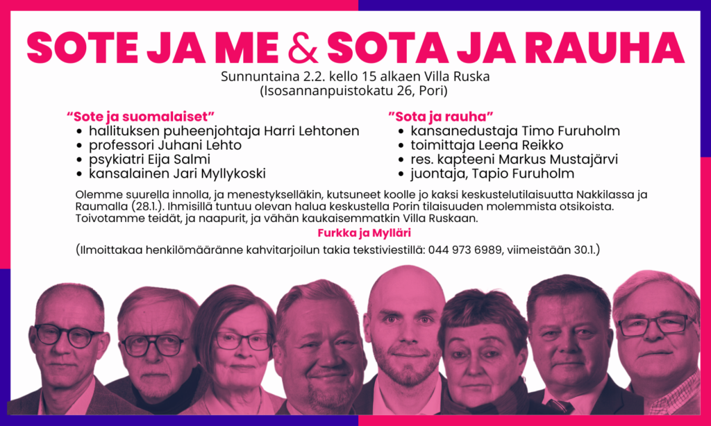 SOTE JA ME & SOTA JA RAUHA -keskustelun koollekutsujina ovat veteraanipoliitikot Jari Myllykoski ja Tapio Furuholm. Yhteistyökumppanina on Satakunnan vasemmistoliitto.