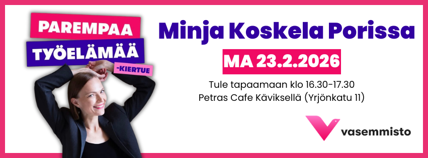 Vasenvoimalla on ilo ilmoittaa, että uusin Minun vasemmistoni -keskustelu järjestetään perjantaina 23. tammikuuta kello 17–19 Porin Puistotalossa.