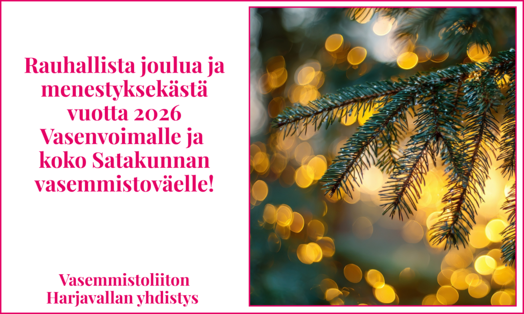 Joulumenot jatkuvat lauantaina 20. joulukuuta, kun porilaiset ja hyvinvointalueen vasemmistoryhmä päivystävät Tuomaan markkinoilla aamusta iltapäivään. Eurajoen vasemmisto telttailee Eurajoen Portilla klo 12–14.