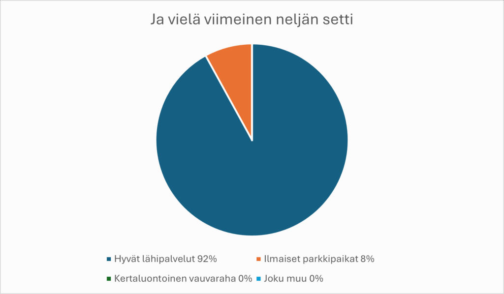 Hyvät lähipalvelut ovat kiistattomasti ihmisten muuttopäätökseen vaikuttava tekijä, vaikka 8% innostuisi harkitsemaan muuttoa ilmaisten parkkipaikkojen takia. Kukaan vastaajista ei pitänyt vauvarahaa houkuttelevana. Joku muu -vastausvaihtoehto toi yhden kommentin viestikenttään: