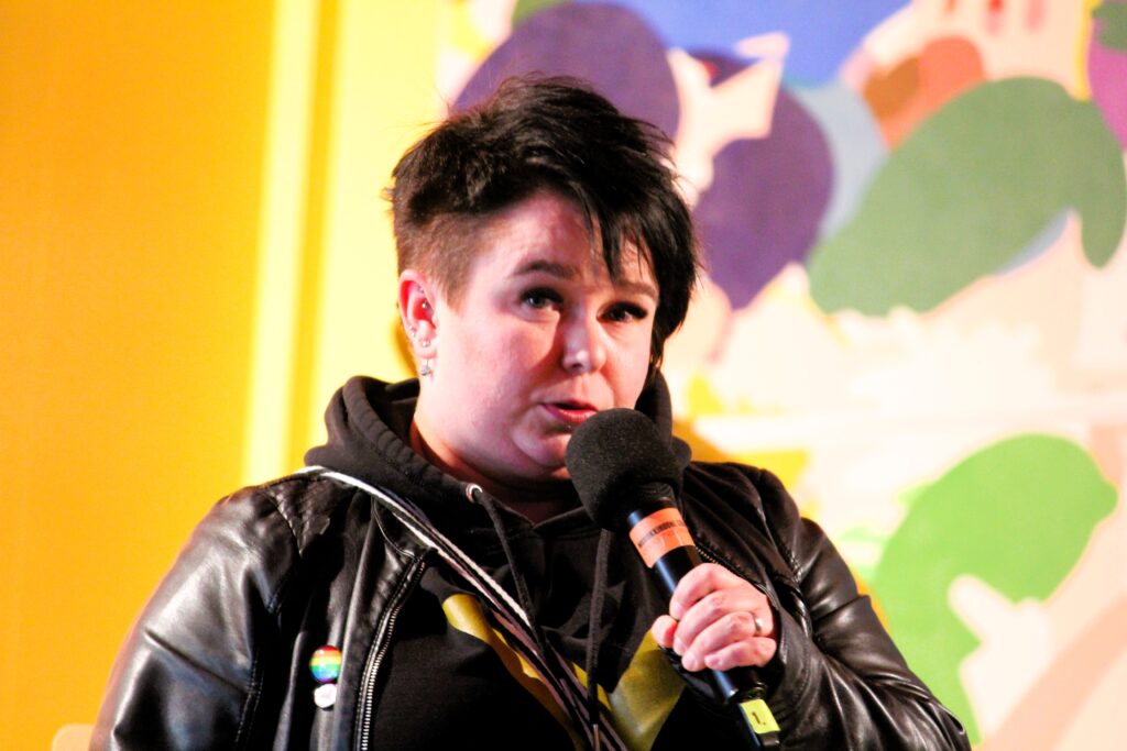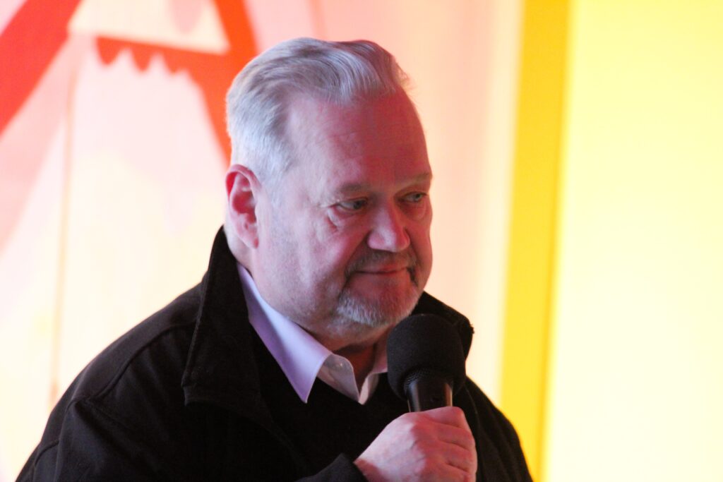 Jutun kirjoittaja kävi mikrofonin takana toivottamassa kaikki mukaan tulevaan vaalityöhön.